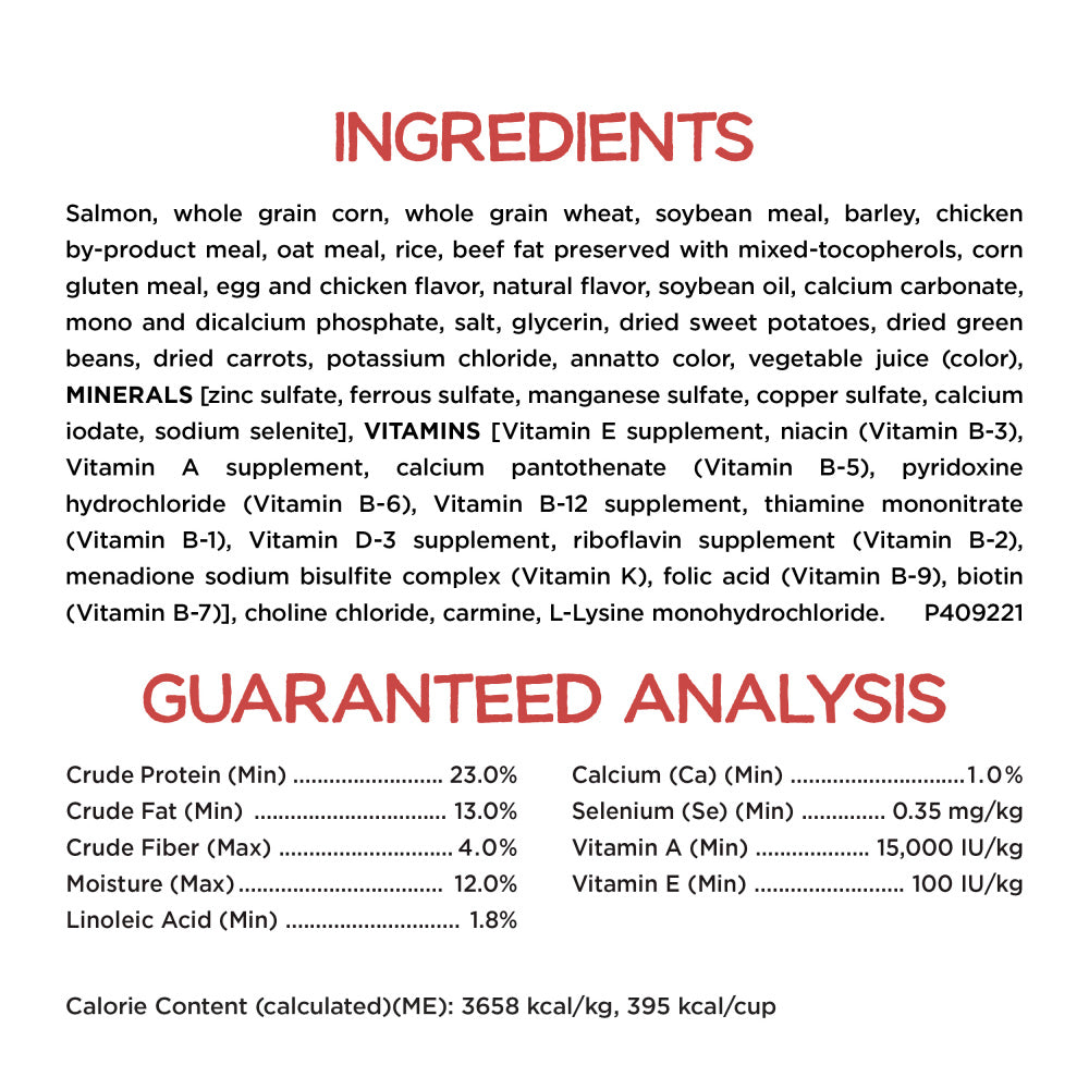 Salmon, Whole Grain Corn, Barley, Rice, Whole Grain Wheat, Chicken By-Product Meal, Corn Gluten Meal, Beef Fat Naturally Preserved With Mixed-Tocopherols, Oat Meal, Soybean Meal, Poultry By-Product Meal, Glycerin, Egg And Chicken Flavor, Mono And Dicalcium Phosphate, Soybean Oil, Poultry And Pork Digest, Calcium Carbonate, Salt, Potassium Chloride, Dried Sweet Potatoes, Dried Green Beans, Dried Carrots, MINERALS [Zinc Sulfate, Ferrous Sulfate, Manganese Sulfate, Copper Sulfate, Calcium Iodate, Sodium Selenite], Iron Oxide (Color), VITAMINS [Vitamin E Supplement, Niacin, Vitamin A Supplement, Calcium Pantothenate, Pyridoxine Hydrochloride (Vitamin B-6), Vitamin B-12 Supplement, Thiamine Mononitrate (Vitamin B-1), Vitamin D-3 Supplement, Riboflavin Supplement (Vitamin B-2), Menadione Sodium Bisulfite (Vitamin K), Folic Acid, Biotin], Choline Chloride, L-Lysine Monohydrochloride. L-4092.