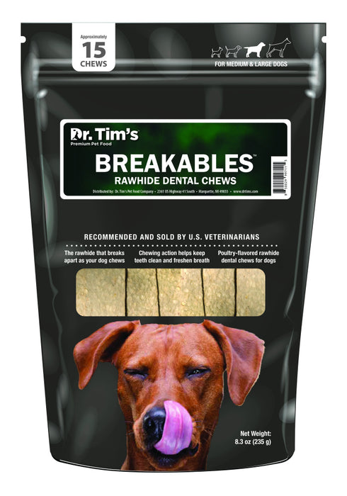 Clean teeth and fresh breath are just a chew away with Dr. Tim's BREAKABLES CLENZ-A-DENT chews! Designed to break apart as your dog chews, shredded pieces of rawhide are compressed, heat-dried and then enzyme coated with a tasty poultry flavoring. The abrasive action of chewing the rawhide scrapes the teeth to remove food build up, keeping the teeth clean and breath noticeably fresher.