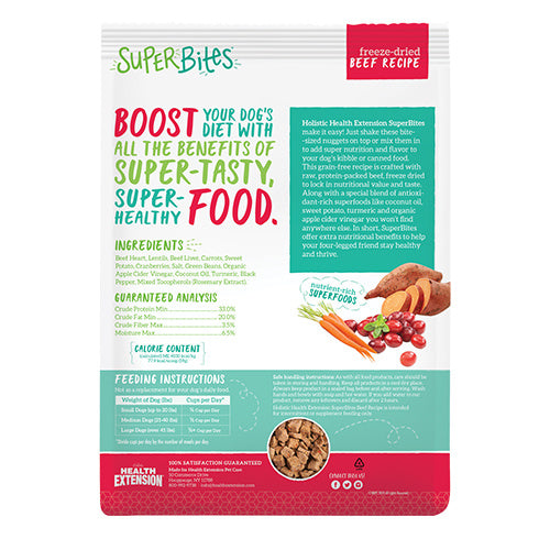 Instantly make any meal more nutritious and tastier for your dog with Health Extension Super Bites Beef Recipe Freeze-Dried Dog Food Mixer. This all-natural meal mixer boosts the flavor of your pups meals, enticing him to clean up his food. With no rendered animal fats or added sugars, its a healthy addition to your dogs diet. The freeze drying process acts as a preservative, so this food is free of artificial preservatives, flavors and fillers. Its grain- and gluten-free and is paw-fect for furry friends who have food sensitivities. Use this mixer to give your dog extra healthy nutrients, make meals more appealing or to simply treat your good boy to an extra-tasty meal.