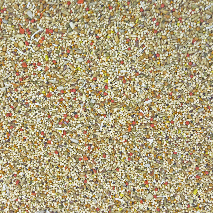 White Millet, Oats, Canary Seeds, Red Millet, Wheat, Ground Corn, Flaxseed, Canola, Dried Egg Product, Brown Rice, Soybean Meal, Caraway Seeds, Flaked Carrots, Cashews, Coconut, Sunflower Seeds, Papaya, Pineapple, Sugar, Canola Oil (preserved with mixed tocopherols), Dicalcium Phosphate, Spinach, Calcium Carbonate, Alfalfa Nutrient Concentrate, Salt, Dried Enterococcus Faecium Fermentation Product, Dried Lactobacillus Acidophilus Fermentation Product, Dried Lactobacillus Casei Fermentation Product, Sunflower Oil, Flaxseed Oil, Cranberries, Apples, Blueberries, Celery, Beets, Parsley, Lettuce, Watercress, Brewer’s Dried Yeast, DL-Methionine, L-Lysine, Choline Chloride, Mixed Tocopherols (preservative), Rosemary Extract, Potassium Chloride, Yeast Extract, L-Carnitine, Vitamin A Supplement, Vitamin D3 Supplement, Vitamin E Supplement, L-Ascorbyl-2-Polyphosphate (Source of Vitamin C), Zinc Sulfate, Ferrous Sulfate, Niacin, Folic Acid, Biotin, Manganese Sulfate, Copper Sulfate, Calcium Pantothenate, Thiamine Mononitrate, Pyridoxine Hydrochloride, Riboflavin Supplement, Zinc Proteinate, Manganese Proteinate, Copper Proteinate, Calcium Iodate, Sodium Selenite, Cobalt Carbonate, Vitamin B12 Supplement, Color Added (Annatto Extract, Turmeric, Beet Juice), Natural Citrus Flavor, Natural Banana Flavor, Natural Pineapple Flavor.