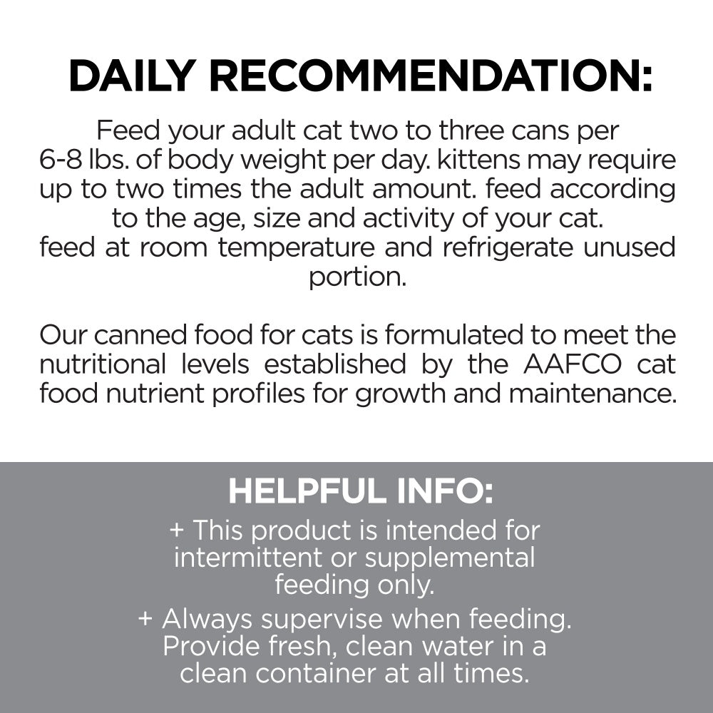 FRIENDLY PSA: This product is complete & balanced, I.E. Unlike some other brands—we didn’t cut any nutritional corners. So, each serving has the proper amount of vitamins and minerals for your growing kitten, adult or senior cat, according to our friends at AAFCO. "