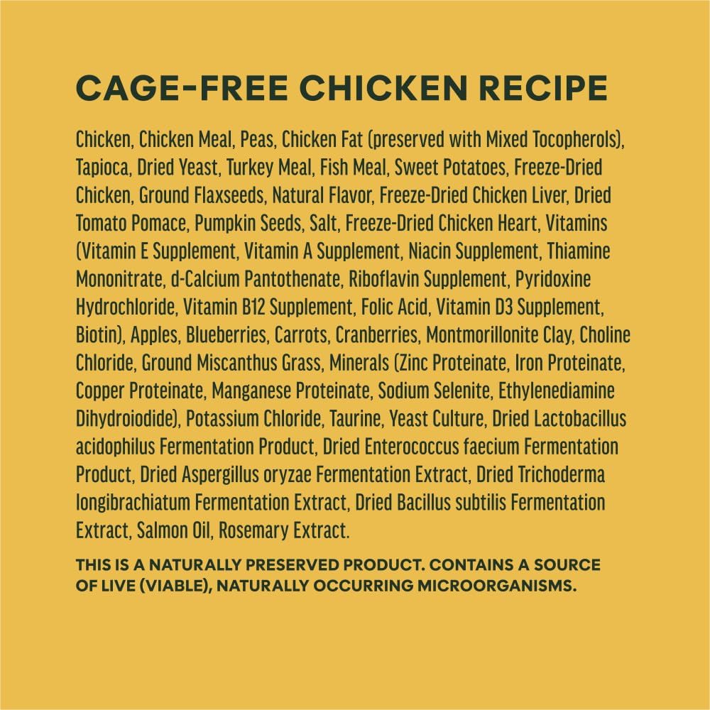 Chicken, Chicken Meal, Peas, Chicken Fat (Preserved Wit Mixed Tocopherols), Tapioca, Dried Yeast, Turkey Meal, Fish Meal, Sweet Potatoes, Freeze-Dried Chicken, Ground Flaxseeds, Natural Flavor, Freeze-Dried Chicken Liver, Dried Tomato Pomace, Pumpkin Seeds, Salt, Freeze-Dried Chicken Heart, Vitamins (Vitamin E Supplement, Vitamin A Supplement, Niacin Supplement, Thiamine Mononitrate, D-Calcium Pantothenate, Riboflavin Supplement, Pyridoxine Hydrochloride, Vitamin B12 Supplement, Folic Acid, Vitamin D3 Supplement, Biotin), Apples, Blueberries, Carrots, Cranberries, Montmorillonite Clay, Choline Chloride, Miscanthus Grass, Minerals (Zinc Proteinate, Iron Proteinate, Copper Proteinate, Manganese Proteinate, Sodium Selenite, Ethylenediamine Dihydroiodide), Potassium Chloride, Taurine, Yeast Culture, Dried Lactobacillus Acidophilus Fermentation Product, Dried Enterococcus Faecium Fermentation Product, Dried Aspergillus Oryzae Fermentation Extract, Dried Trichoderma Longibrachiatum Fermentation Extract, Dried Bacillus Subtilis Fermentation Extract, Salmon Oil, Rosemary Extract.