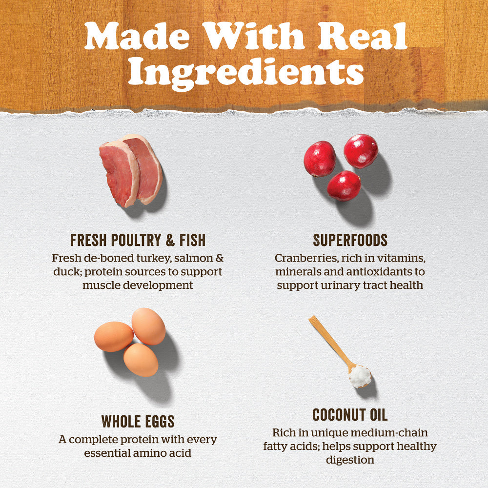De-boned turkey, potatoes, peas, pea fiber, potato flour, whole dried egg, natural flavor, flaxseed, canola oil (preserved with mixed tocopherols), de-boned salmon, de-boned duck, alfalfa, coconut oil (preserved with mixed tocopherols), calcium carbonate, tomato, apples, carrots, pumpkin, sweet potatoes, squash, bananas, blueberries, cranberries, blackberries, pomegranate, papayas, lentils, broccoli, cottage cheese, DL-methionine, taurine, choline chloride, sodium chloride, dried chicory root, phosphoric acid, vitamins (vitamin E supplement, niacin, L-ascorbyl-2-polyphosphate (a source of vitamin C), thiamine mononitrate, biotin, vitamin A supplement, d-calcium pantothenate, beta-carotene, riboflavin, pyridoxine hydrochloride, vitamin B12 supplement, vitamin D3 supplement, folic acid), minerals (zinc proteinate, ferrous sulfate, zinc oxide, iron proteinate, copper sulfate, sodium selenite, copper proteinate, manganese proteinate, manganous oxide, calcium iodate), dried Lactobacillus acidophilus fermentation product, dried Enterococcus faecium fermentation product, L-lysine, potassium chloride, yucca schidigera extract, L-carnitine, dried rosemary.
