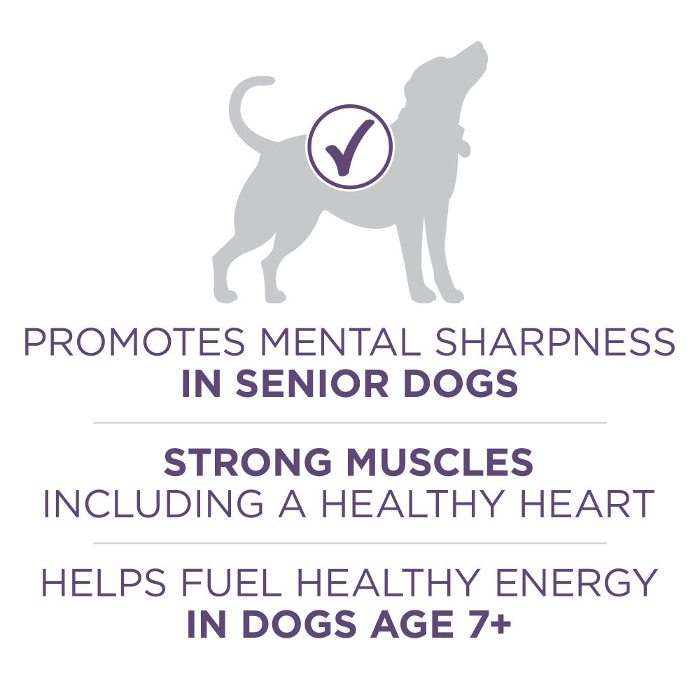 Your senior dog has unique nutritional needs, and Purina ONE SmartBlend Vibrant Maturity Adult 7+ Formula dry dog food helps you to meet those needs. This senior dry dog food recipe is created for the changing needs of dogs seven and older, with enhanced botanical oils to help promote mental sharpness, and it's high in protein to support your dog's strong muscles and heart. A dual-defense antioxidant blend helps support his strong immune system, and omega-6 fatty acids help support healthy skin and coat to help him look his best every day. The crunchy kibble helps clean your dog's teeth and keep his gums healthy, and the combination of tender morsels and crunchy bites provides a taste and texture dogs love. With vitamins E and A, this dry dog food for senior dogs helps to support his bright eyes. Serve Purina ONE SmartBlend Vibrant Maturity Adult 7+ as his main daily meal, or add one of our Purina ONE wet dog food formulas for extra variety in his diet. As your dog ages, you want to make sure he's still getting the nutrition he needs to be his best self. That's why this recipe offers a SmartBlend of innovative nutrition and purposeful ingredients that naturally work together to provide your dog with lifelong whole body health you can see. We craft this recipe in our Purina-owned U.S. facilities, so you can rest easy knowing his meals are coming from a trusted source. Each batch goes through rigorous checks for quality and safety throughout the production process to give you added peace of mind, and quality is our top priority in every wet and dry dog food we produce. Backed by Purina's more than 90 years of innovation, Purina ONE is a brand we are proud to create for your dog and his unique nutritional needs. Fill his bowl with Purina ONE SmartBlend Vibrant Maturity Adult 7+ Formula dry dog food every day, and show him just how important his health and happiness are to you.