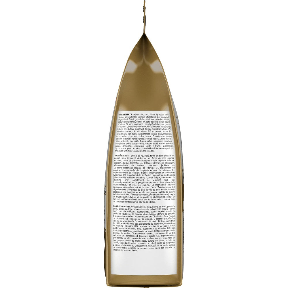 Brewers rice, corn, chicken by-product meal, chicken fat, wheat gluten, pork meal, natural flavors, dried chicory root, vegetable oil, fish oil, grain distillers dried yeast, potassium chloride, sodium silico aluminate, vitamins [DL-alpha tocopherol acetate (source of vitamin E), niacin supplement, L-ascorbyl-2-polyphosphate (source of vitamin C), D-calcium pantothenate, biotin, pyridoxine hydrochloride (vitamin B6), riboflavin supplement, thiamine mononitrate (vitamin B1), vitamin A acetate, folic acid, vitamin B12 supplement, vitamin D3 supplement], salt, fructooligosaccharides, sodium tripolyphosphate, monocalcium phosphate, choline chloride, DL-methionine, taurine, calcium carbonate, marigold extract (Tagetes erecta L.), trace minerals [zinc proteinate, zinc oxide, ferrous sulfate, manganese proteinate, manganous oxide, copper sulfate, calcium iodate, sodium selenite, copper proteinate], magnesium oxide, L-lysine, glucosamine hydrochloride, green tea extract, chondroitin sulfate, rosemary extract, preserved with mixed tocopherols and citric acid.Guaranteed Analysis